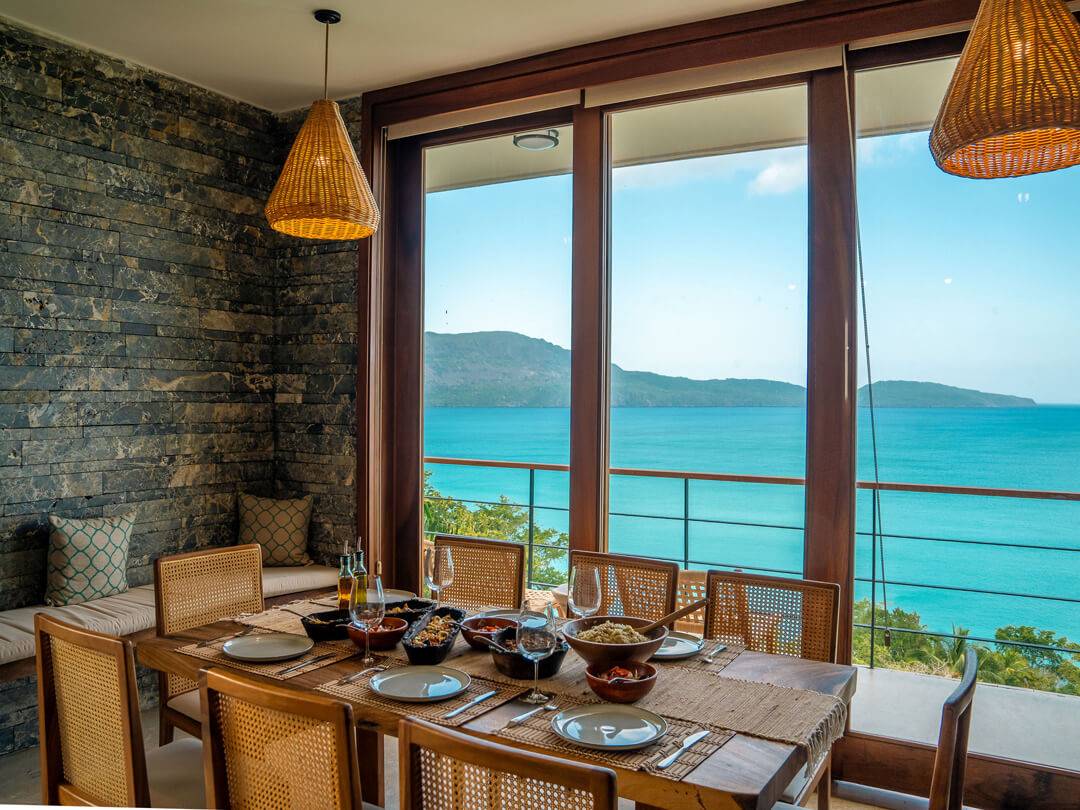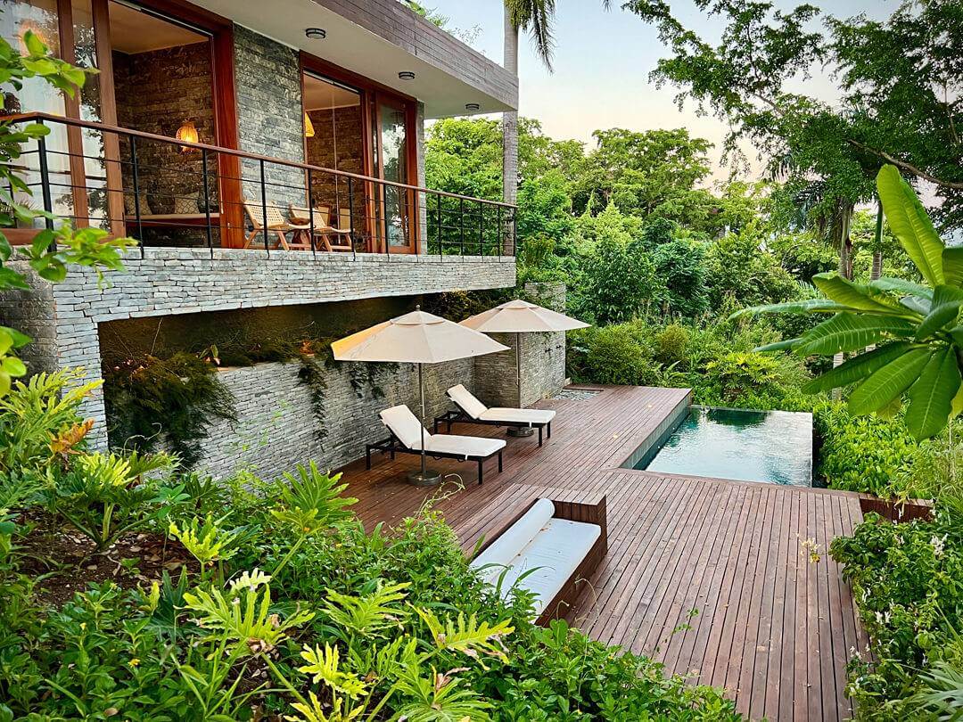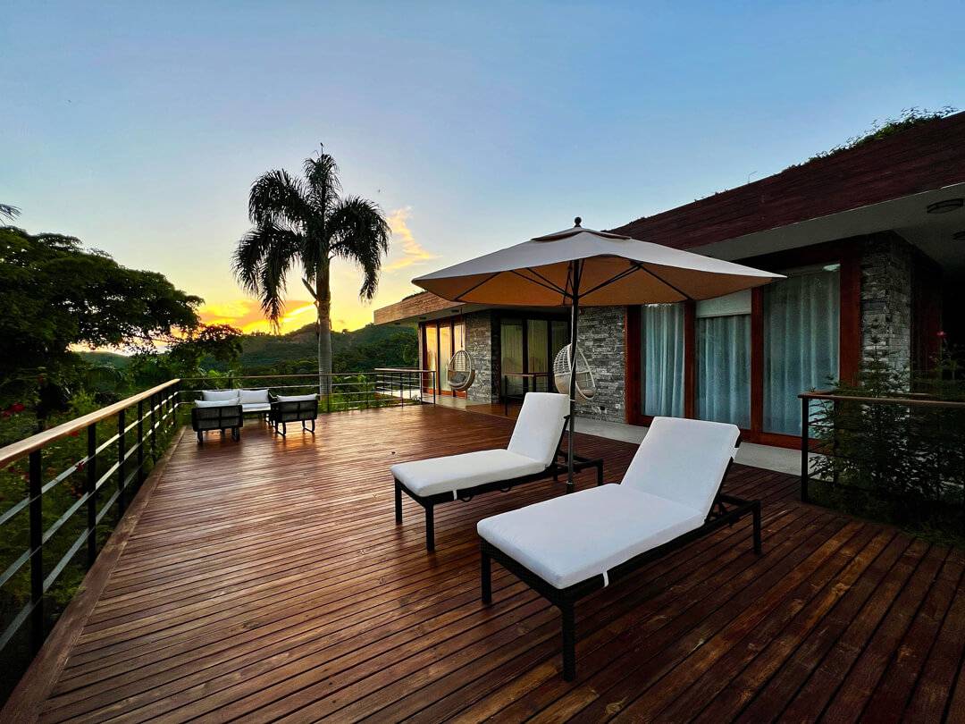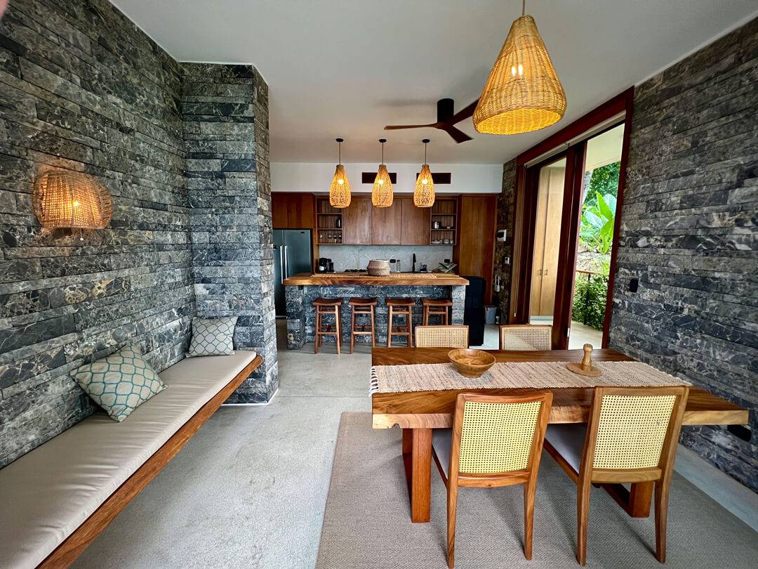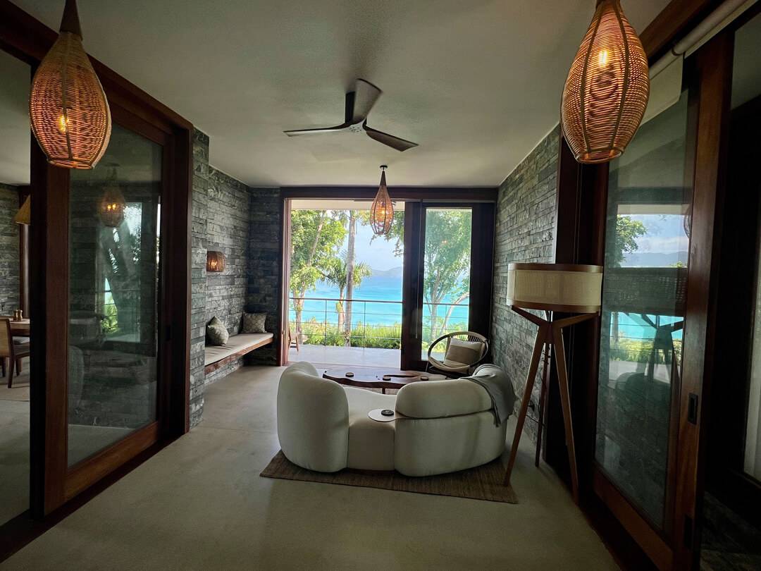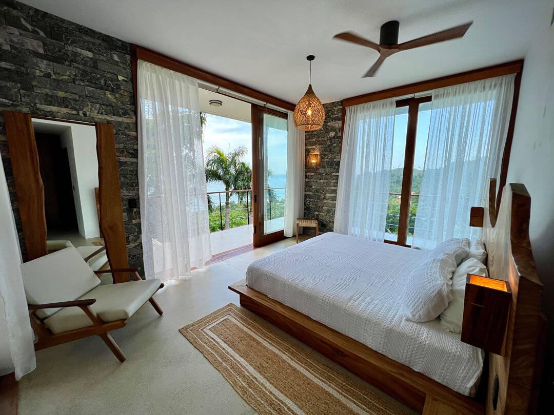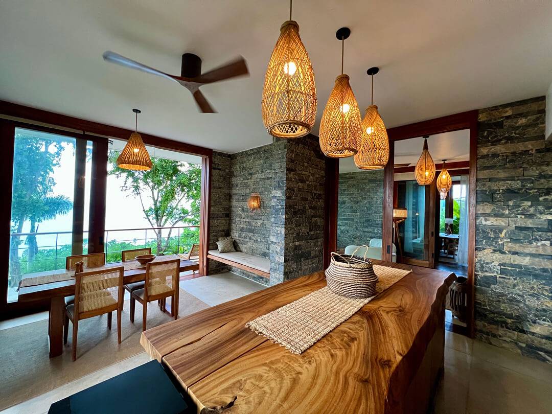 The top floor houses two master bedrooms, adorned with a live-edge king bed and floor-to-ceiling sliding doors that dissolve the boundaries between indoors and outdoors. The adjoining natural slate indoor-outdoor bathroom with carved wooden sinks creates a sensory connection with the elements. Step onto the covered wraparound veranda, where expansive wooden decks and a cozy hanging chair beckon, inviting you to gaze at the azure ocean expanse below. Beyond, a splendid sun deck offers a setting for lounging, savoring cocktails, relishing in open-air dining, and stargazing.