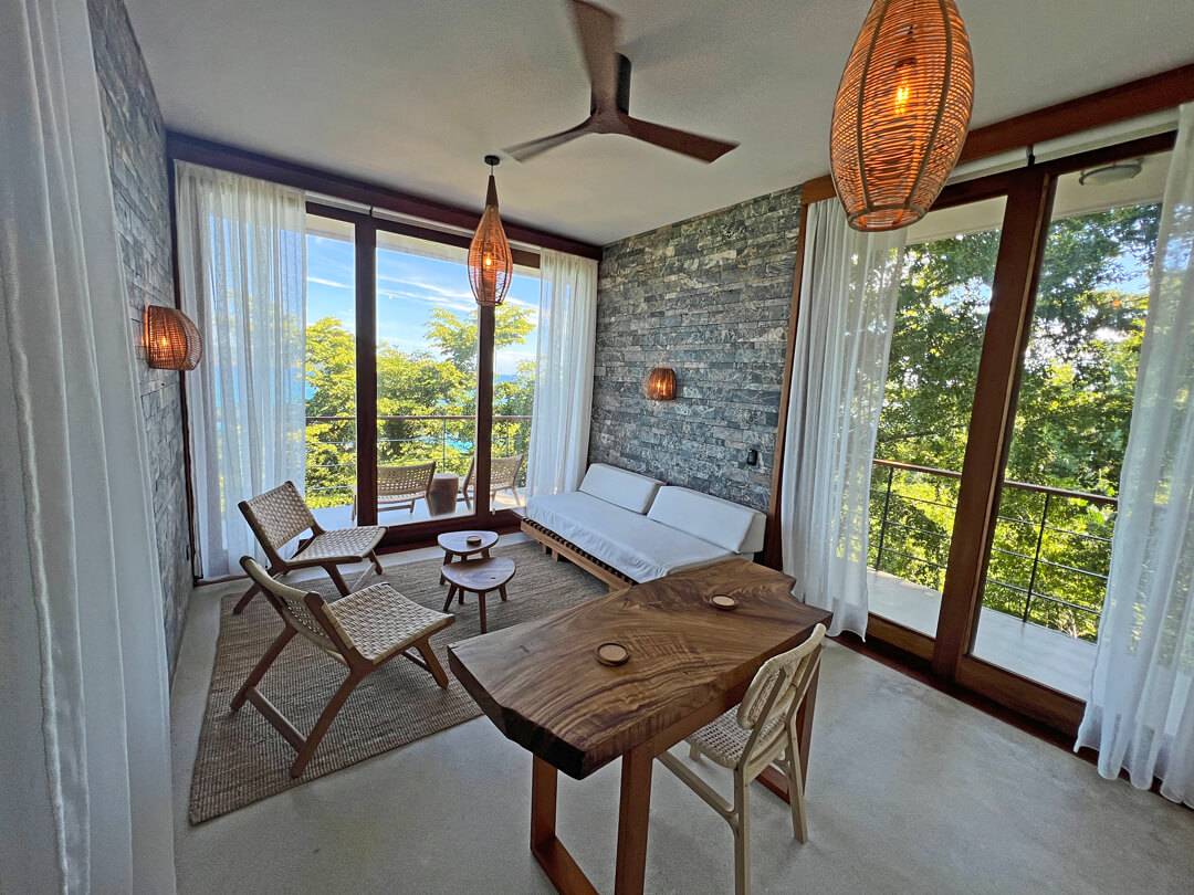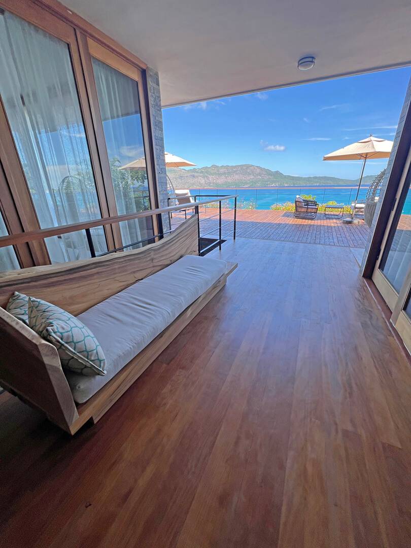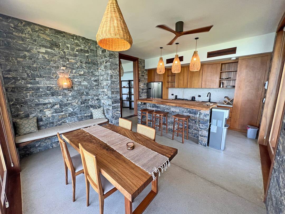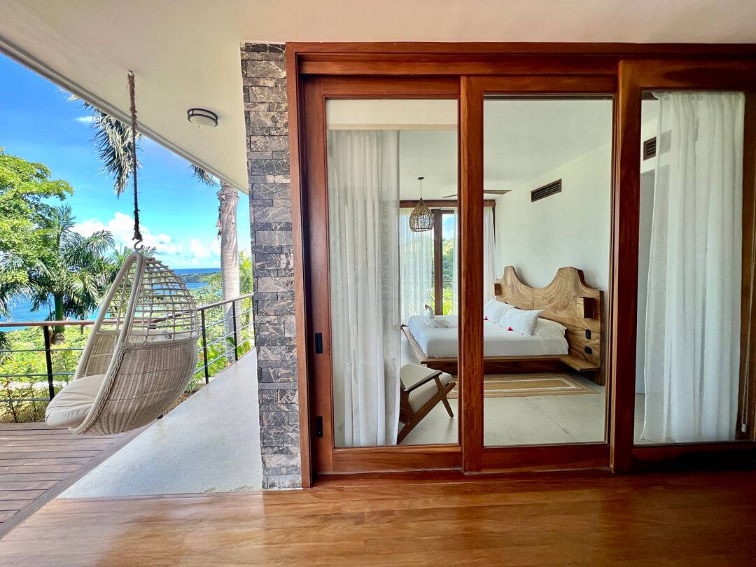 The top floor houses the master bedroom, adorned with a live-edge king bed and floor-to-ceiling sliding doors that dissolve the boundaries between indoors and outdoors. The adjoining natural slate indoor-outdoor bathroom with carved wooden sinks creates a sensory connection with the elements. Step onto the covered wraparound veranda, where a cozy hanging chair beckons, inviting you to gaze at the azure ocean expanse below. Beyond, a splendid sun deck offers a setting for lounging, savoring cocktails, relishing in open-air dining, and stargazing.