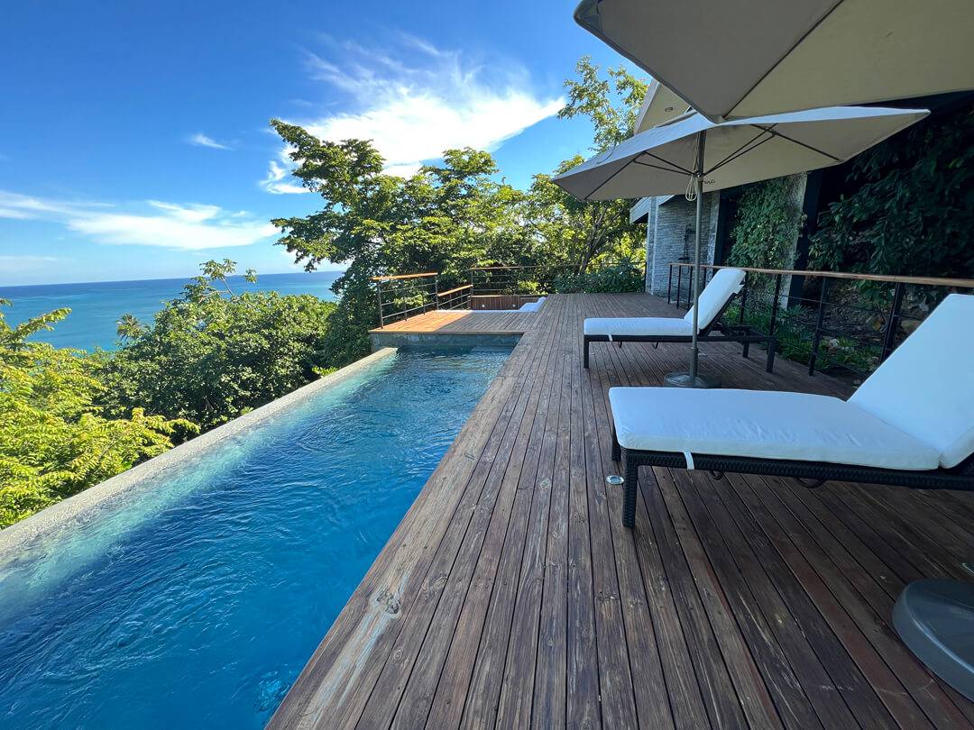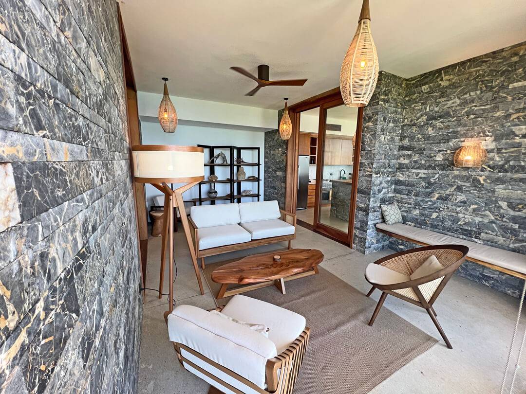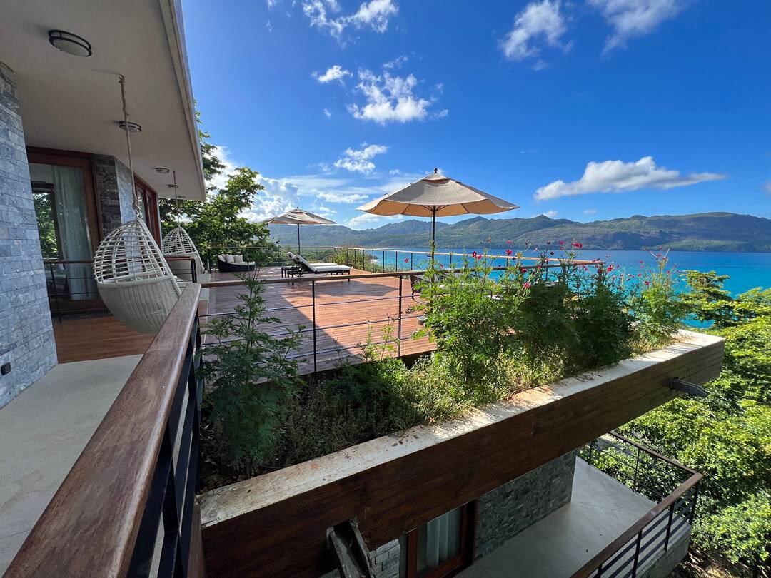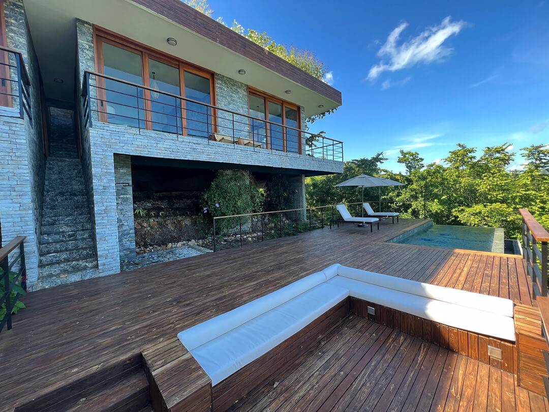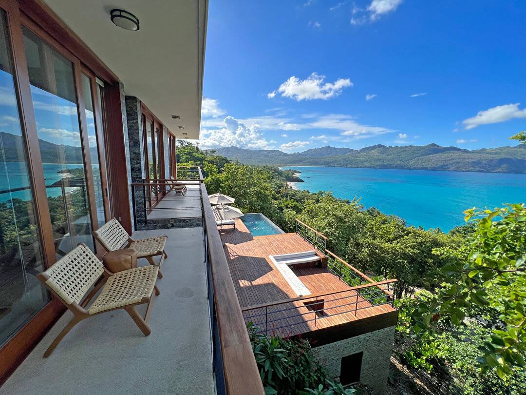 The top floor houses the master bedroom, adorned with a live-edge king bed and floor-to-ceiling sliding doors that dissolve the boundaries between indoors and outdoors. The adjoining natural slate indoor-outdoor bathroom with carved wooden sinks creates a sensory connection with the elements. Step onto the covered wraparound veranda, where a cozy hanging chair beckons, inviting you to gaze at the azure ocean expanse below. Beyond, a splendid sun deck offers a setting for lounging, savoring cocktails, relishing in open-air dining, and stargazing.