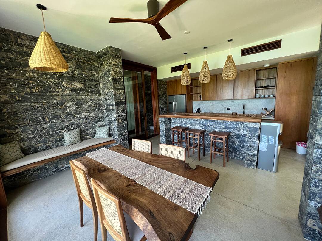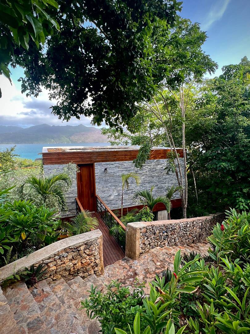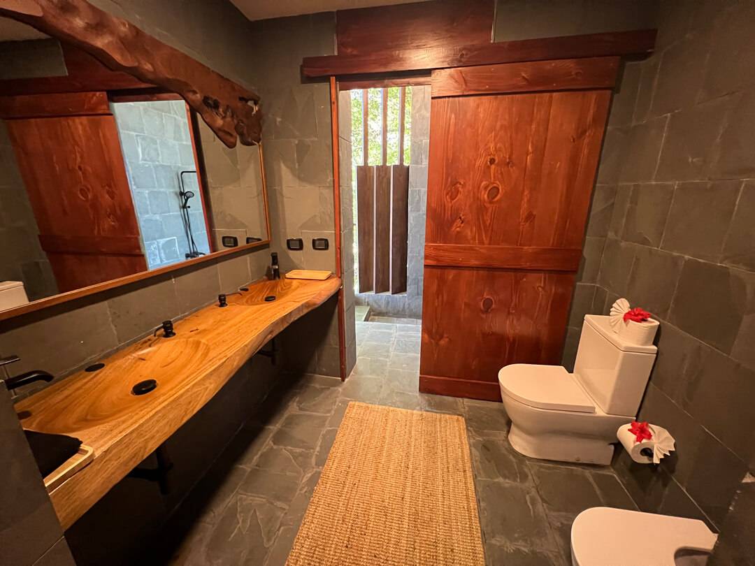 The top floor houses the master bedroom, adorned with a live-edge king bed and floor-to-ceiling sliding doors that dissolve the boundaries between indoors and outdoors. The adjoining natural slate indoor-outdoor bathroom with carved wooden sinks creates a sensory connection with the elements. Step onto the covered wraparound veranda, where expansive wooden decks and a cozy hanging chair beckon, inviting you to gaze at the azure ocean expanse below. Beyond, a splendid sun deck offers a setting for lounging, savoring cocktails, relishing in open-air dining, and stargazing.