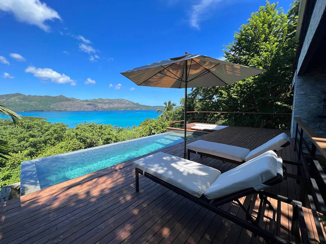 Adjacent to this, a flexible space awaits—ideal for relaxation, lounging, or converting into a cozy secondary queen bedroom, complete with an ensuite natural slate bathroom, outdoor shower, and a work desk. A descent to the third level reveals another inviting wooden sun deck, outdoor shower, and an 18-foot infinity pool, adorned with natural slate tiles. Here, you have the opportunity to envelop yourself in calmness, relishing uninterrupted periods while being serenaded by the orchestra of nature.